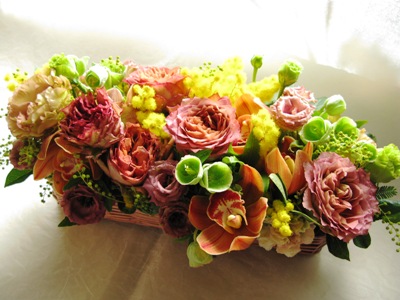 アレンジ。シンビジウムもトルコギキョウもいい色、ミモザはふわふわ。そこに