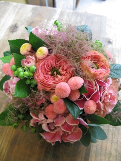 (写真は送別用アレンジ。バラ「ピンクラナンキュラ」、あじさい、
