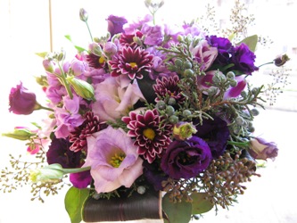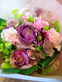 (写真は本日の活け込みブーケ。トルコギキョウ2種類、マム、ストック、