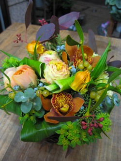 (写真は誕生日のお祝いアレンジ、バラ「コーヒーブレイク」、カラー「マンゴー」、