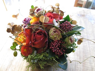 (写真は個展のお祝いアレンジ。バラ「コーヒーブレイク」、シンビジウム、