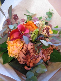(写真は誕生日のお祝いアレンジ、バラ「コーヒーブレイク」、カラー「マンゴー」、