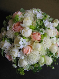 ↓バラ「ウェディングドレス」、トルコギキョウ、カーネーション、