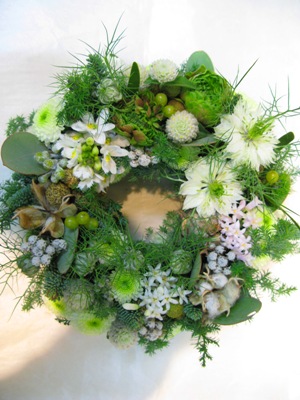 (写真はリース型アレンジ。ご自宅用。ニゲラ、マム、ヤドリギ、バーゼリア、