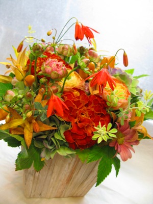 (写真はお祝いアレンジ。コスモス、秋色ミナズキ、トルコギキョウ、