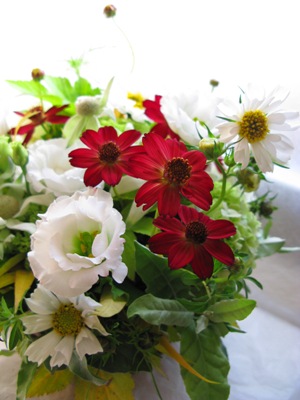 (写真はカフェのオープンお祝いアレンジ。白のコスモス、チョコレートコスモス、