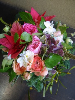 (写真はお祝いのアレンジ。バラ「サーモン」、ポインセチア、