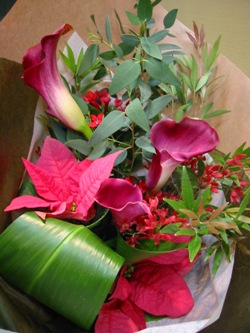 (写真は還暦のお祝いブーケ。カラー、ポインセチア、ブバリア、