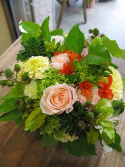 (写真↑はお祝いアレンジ。バラ「グリーンローズ」、カシワバアジサイ、