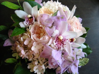 (写真は送別用のアレンジ。バラ「トロワラス」、シンビジウム、あじさい、