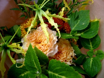 (写真は送別用のブーケ。バラ「ラ・カンパネラ」、グロリオサ「ルテア」、