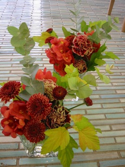 (写真はカフェの活け込み。スプレーマム、カーネーション、モカラ、