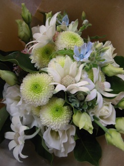 (写真のお供えブーケは、スプレーマム、フランネルフラワー、