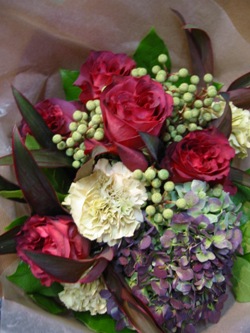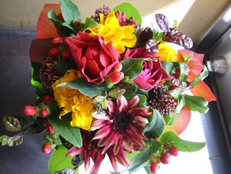 (写真は還暦のお祝いブーケ。バラ「ファンキー」、あじさい、