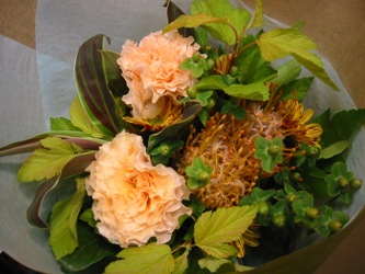(写真は送別用のブーケ。バラ「ラ・カンパネラ」、ピンクッション、