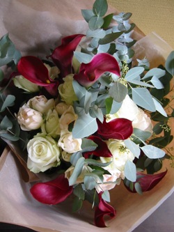 (写真は誕生日のお祝いブーケ。”白いバラとムラサキの花で!”