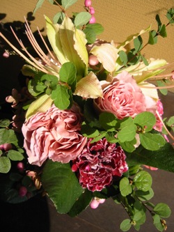 (写真は結婚のお祝いアレンジ。アネモネ、バラ「アンティークレース」、