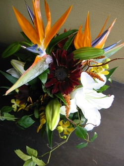 (写真はお祝いアレンジ。ストレリチア、ひまわり「ムーランルージュ」、