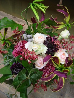 (写真は結婚記念日のお祝いアレンジ。グロリオサ、クリスマスブッシュ、