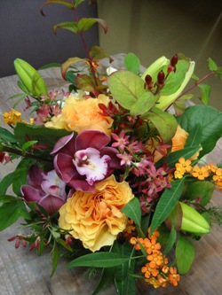 (写真は送別用ブーケ。バラ「テラノストラ」、マリーゴールド、