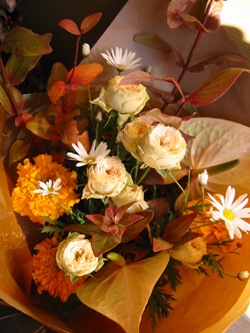 (写真はちょっとおみやげのブーケ。バラ、マリーゴールド、