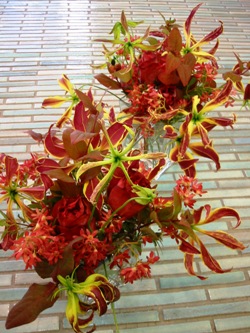 (写真はカフェの活け込み。グロリオサ、バラ「ファンキー」、