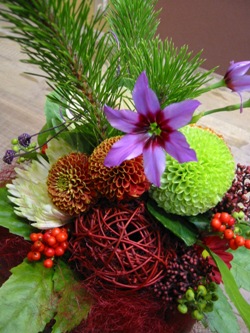(写真はお正月アレンジ。松、千両、菊、リューココリネ、シキミア、