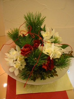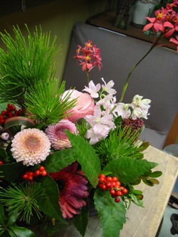 (写真はお正月ブーケ。松、千両、シンビジウム、ハボタン、ドラセナ。)