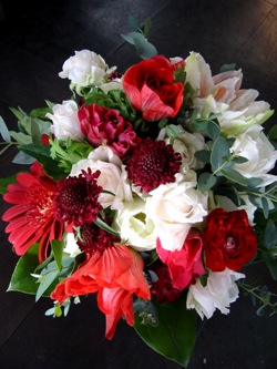 (写真は成人のお祝いアレンジ。バラ、アマリリス、スカビオサ、