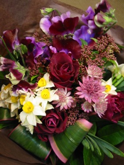 (写真は誕生日のお祝いブーケ。バラ「リーク」、アストランティア、
