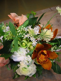 (写真は新築のお祝いアレンジ。シンビジウム「マジョリカ」、こでまり、