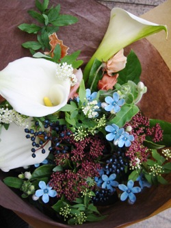 (写真は送別用ブーケ。カラー、ピュアブルー、こでまり、ガマズミ、