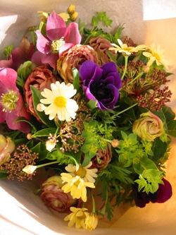 (写真は誕生日のお祝いブーケ。マーガレット、トルコギキョウ、