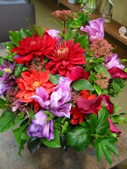 (写真はショップオープンのお祝いアレンジ。ダリア、バラ「カルーセル」、