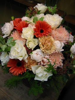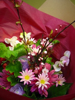 今日の写真(↑)は、お祝いのブーケです。今朝電話で「季節感のある