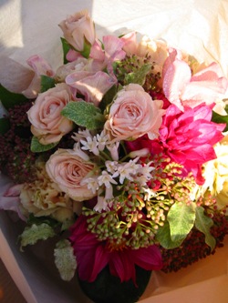 (写真は、友人へいろんな気持ちをこめたブーケ。バラ、ダリア、
