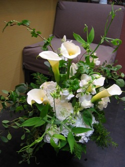 (↑の写真は送別用のアレンジ。シンビジウム、スカビオサ、あじさい、