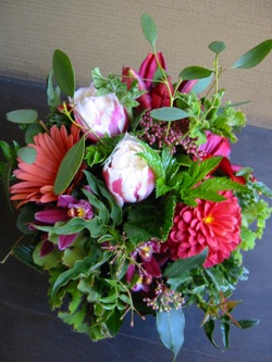 (写真は、友人へいろんな気持ちをこめたブーケ。バラ、ダリア、