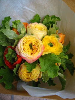 (写真はお祝いブーケ。バラ「レモンラナンキュラ」、ラナンキュラス、