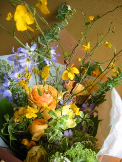 今日の写真(↑)は、お祝いのブーケです。今朝電話で「季節感のある