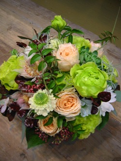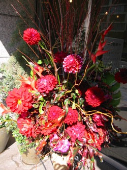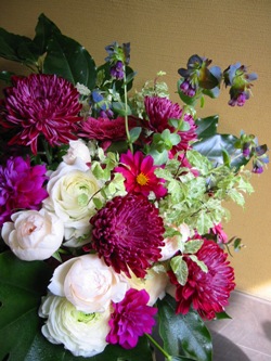 (写真はお祝いアレンジ。ダリア、菊、ラナンキュラス、セリンセ、