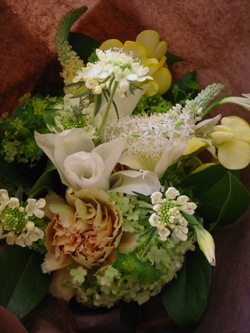 (写真は送別用ブーケ。菊「ココア」・「フロッギー」、スイートピー、