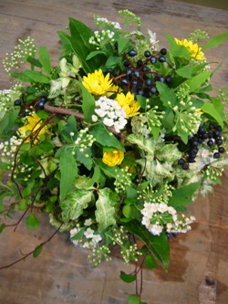 (写真は送別用のアレンジ。ローダンセ、ビバーナム・ティナス、