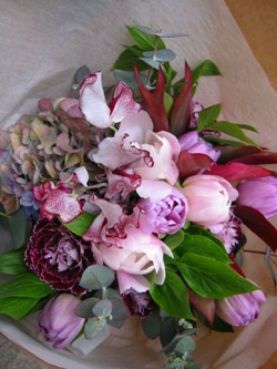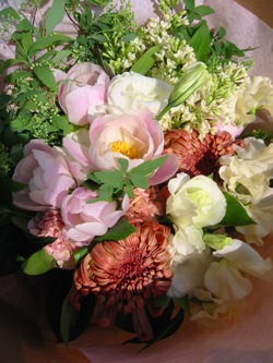 (写真は送別用ブーケ。シャクヤク、菊、トルコギキョウ、ライラック、