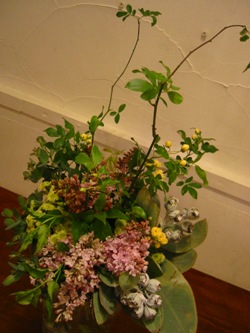 (写真は本日のカフェの活け込み。モッコウバラ、ライラック、