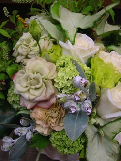「アバランチェ」、カーネーション3種類、ビバーナム、りょうぶ、