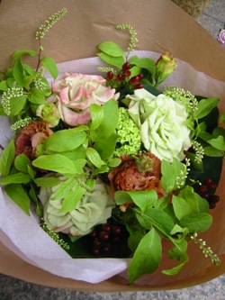 (写真はお祝いのブーケ。バラ「ジプシーキュリオーサ」、りょうぶ、
