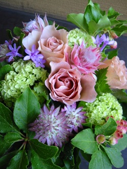 (写真は、出産祝いのアレンジ。バラ「ポルボロン」、あじさい、