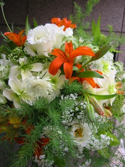 (写真は結婚のお祝いブーケ。バラ「ジュリア」、チョウジソウ、そけい、