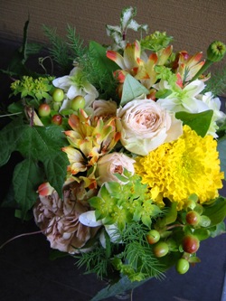 (写真は送別用ブーケ。バラ「ロマネスク」、セルリア、スカビオサ、